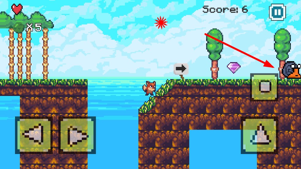 2、遭遇帶毒蝸牛等敵人,點擊攻擊按鈕,發(fā)射豌豆,將其消滅,面對懸崖,則需要計算跳躍距離,避免太近,導致角色跳躍不起來。