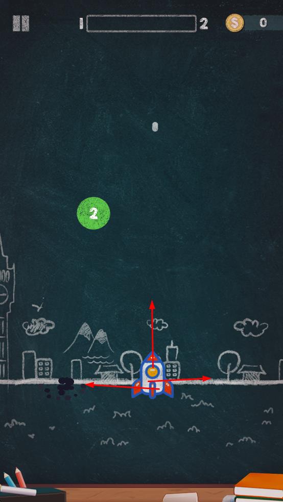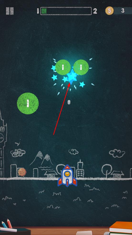 1、滑動(dòng)屏幕操控火箭射擊方向,攻擊空中綠色圓球目標(biāo),開(kāi)啟戰(zhàn)斗。