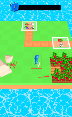 2、操控紅框藍(lán)色角色,沿橙色路徑收集60水果。