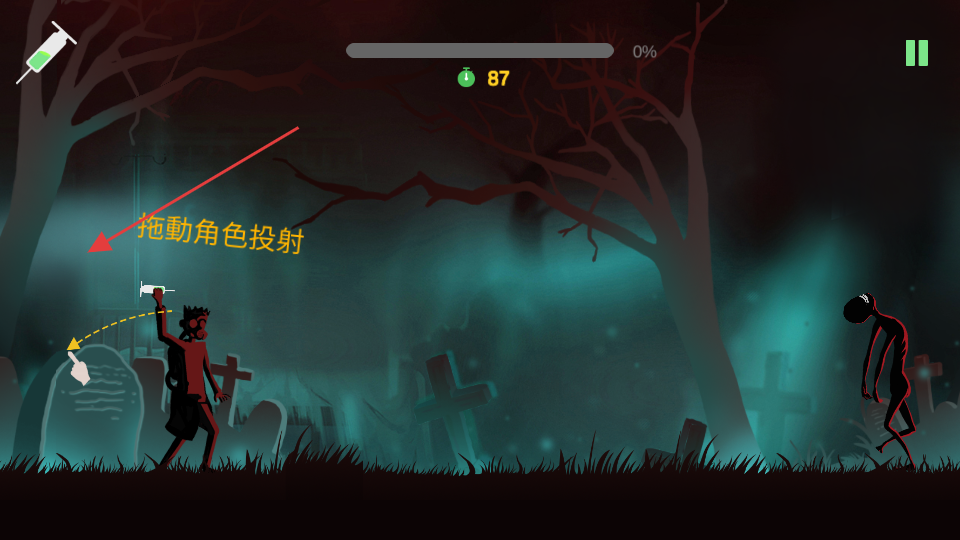 1、進(jìn)入游玩場景,按提示拖角色投射,拖動角色瞄準(zhǔn)僵尸,松開完成注射器投擲攻擊,開啟戰(zhàn)斗。