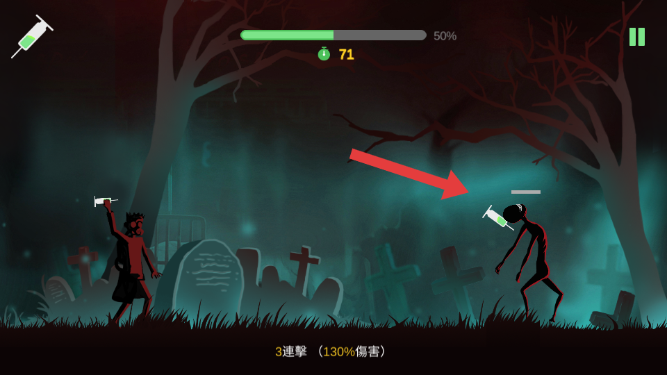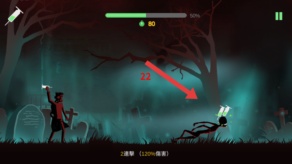 2、投擲注射器命中僵尸后,會造成傷害,如顯示2連擊120%傷害,持續(xù)攻擊可積累連擊提升傷害。