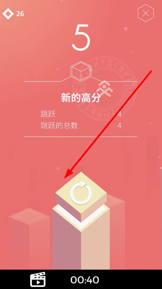 3、每輪結(jié)束顯示跳躍數(shù)、分?jǐn)?shù),點(diǎn)擊重置按鈕重玩,消耗鉆石解鎖新方塊,或者觀看廣告,繼續(xù)本次闖關(guān)。