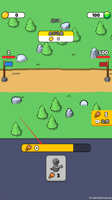 1、在戰(zhàn)斗1關卡,留意屏幕下方黃色能量條,收集雞腿圖標如看廣告免費獲取填充能量條,積累召喚勇士的資源。