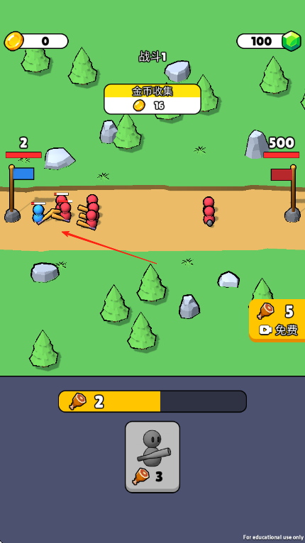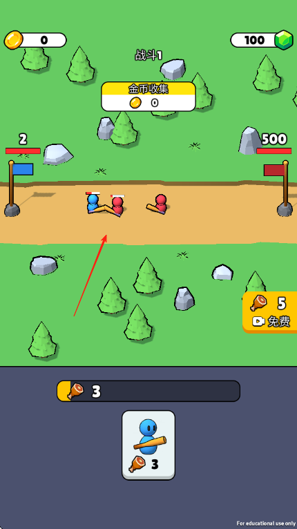 2、能量條有足夠能量后,點擊下方勇士圖標,按紅箭頭方向召喚藍色勇士進入戰(zhàn)場,與敵方紅色勇士戰(zhàn)斗。