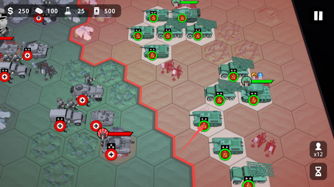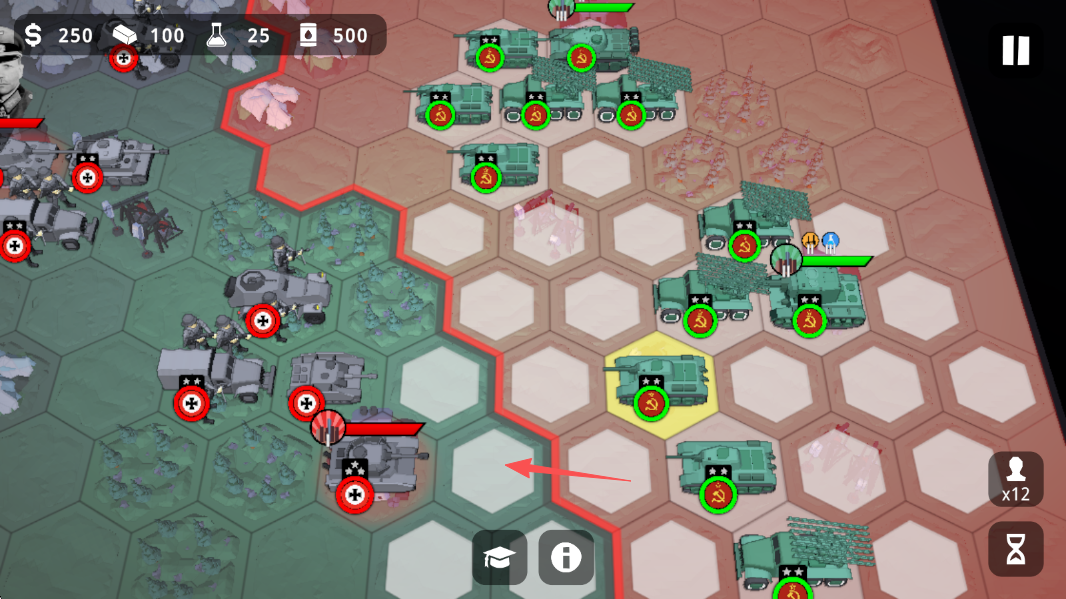 1、戰(zhàn)斗時(shí)觀察【綠色坦克】位置,依箭頭指引調(diào)動(dòng)單位,利用六邊形格位推進(jìn),壓制敵方陣地。