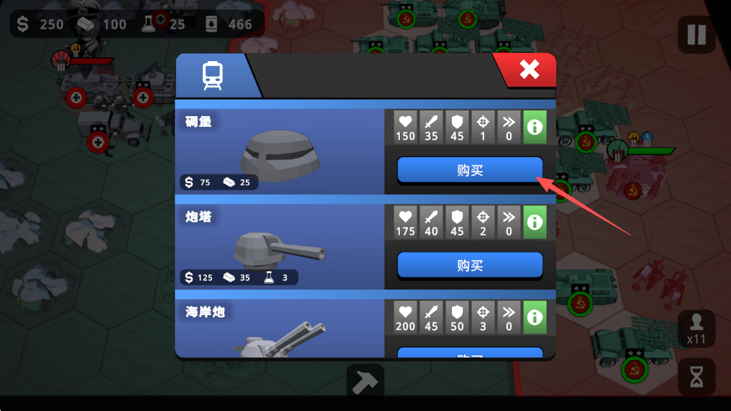 3、消耗【$75-25】資源購買【碉堡】,依托防御建筑構(gòu)建陣地,提升部隊(duì)生存與反擊能力。