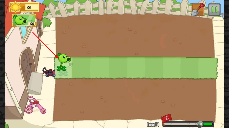2、使用積累的陽(yáng)光,在草坪上種植豌豆射手,讓植物扎根于場(chǎng)地,開啟防御僵尸的進(jìn)程。