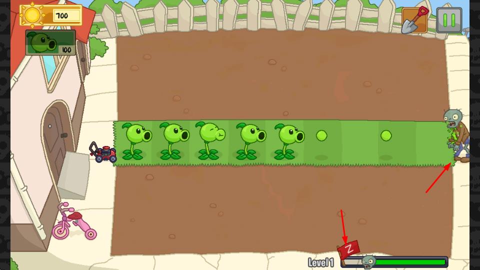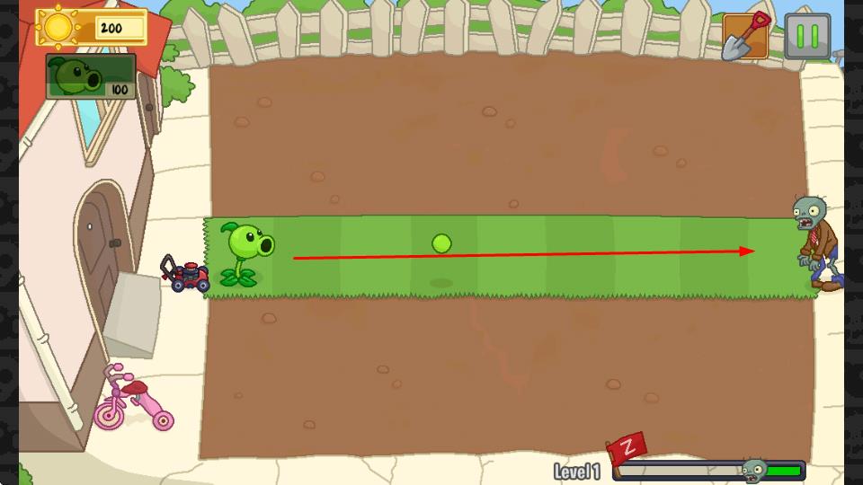 3、豌豆射手會(huì)自動(dòng)發(fā)射豌豆,攻擊從右側(cè)出現(xiàn)的僵尸,阻攔僵尸靠近房屋的步伐。