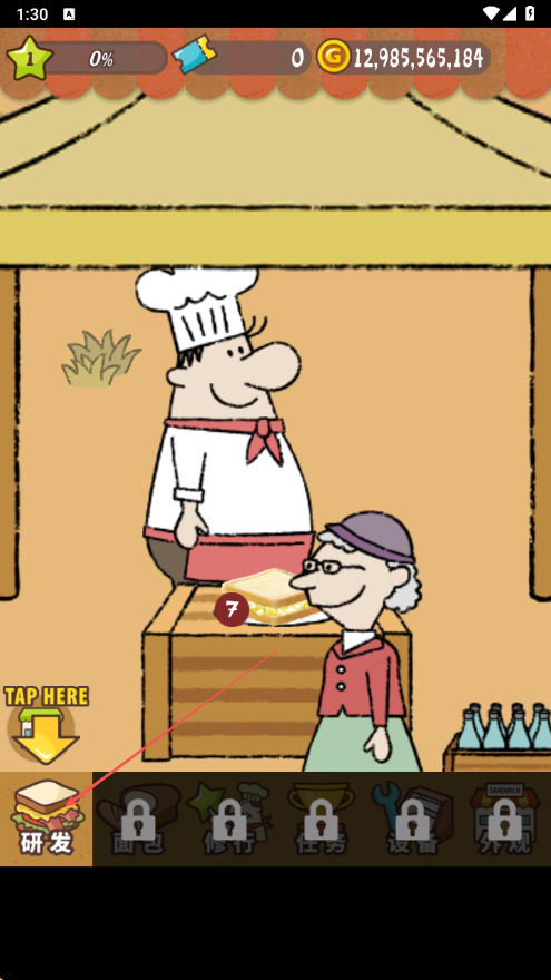 4、積累一定金幣后,點(diǎn)擊左下角研發(fā)按鈕,解鎖新的菜品或升級店鋪設(shè)施。