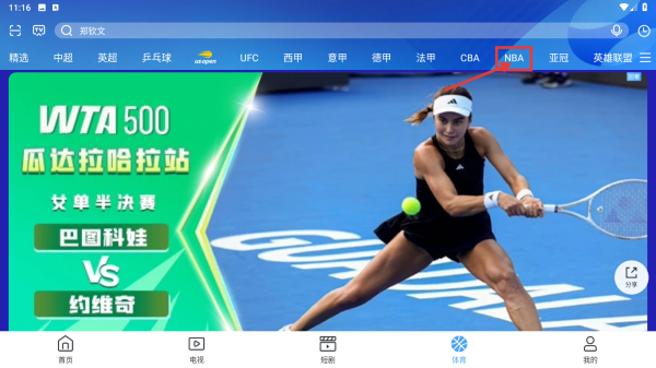 2、在體育頁面,點擊頂部NBA分類標簽,查看NBA相關體育內(nèi)容。