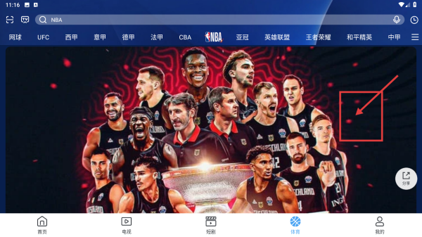 3、在NBA內(nèi)容展示區(qū),點擊男籃歐錦賽相關內(nèi)容,進入賽事視頻播放頁。