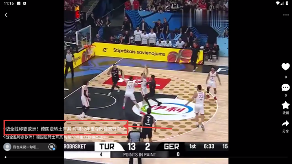 4、在賽事視頻播放頁,觀看德國逆轉(zhuǎn)土耳其等男籃歐錦賽賽事視頻。