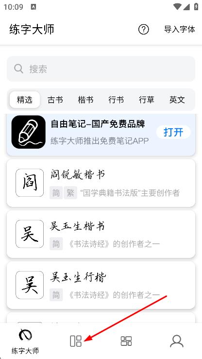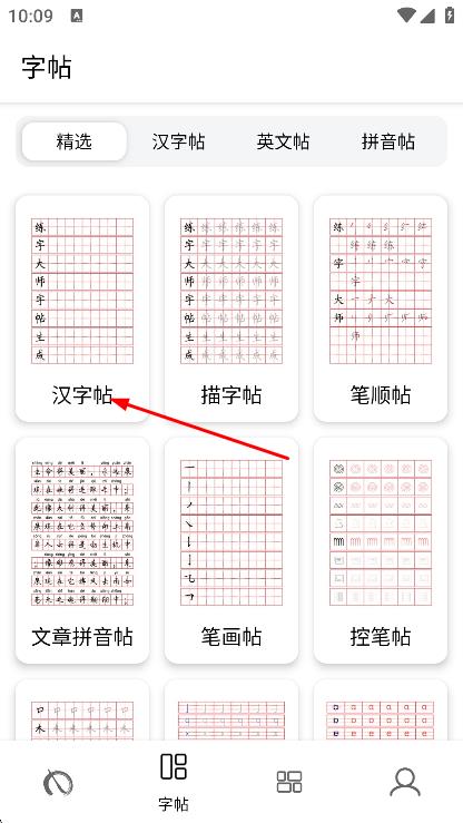1、在首頁,點擊底部字帖圖標(biāo),進入字帖頁面。