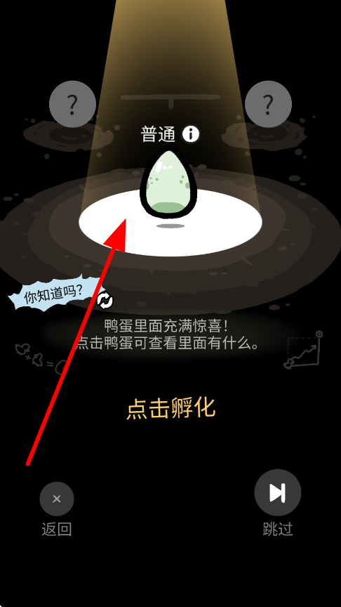 1、開局會看到處于鴨窩里面的小鴨下的鴨蛋,界面提示鴨蛋里充滿驚喜,可以點(diǎn)擊孵化,就能開啟鴨蛋孵化過程,等待孵化出屬于你獨(dú)一無二的鴨子。