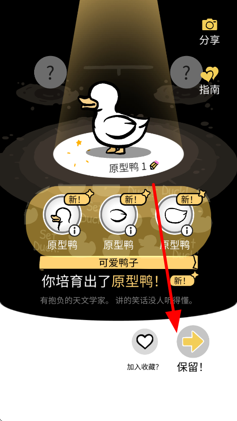 2、鴨蛋成功孵化出鴨子后,像孵化出原型鴨時(shí),界面會展示鴨子形象及相關(guān)介紹,此時(shí)可選擇保留,將這只鴨子留存下來,用于后續(xù)的培育等操作。