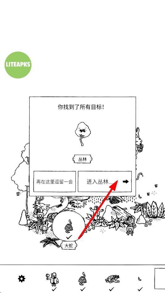 4、當(dāng)找到所有目標(biāo)后,點(diǎn)擊進(jìn)入?yún)擦职粹o進(jìn)入下一場景,完成目標(biāo)是解鎖新關(guān)卡的關(guān)鍵,推動(dòng)游戲探索進(jìn)程。