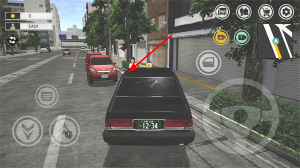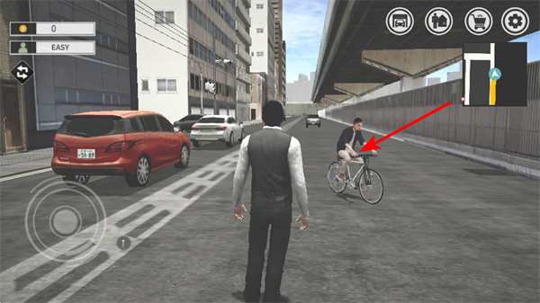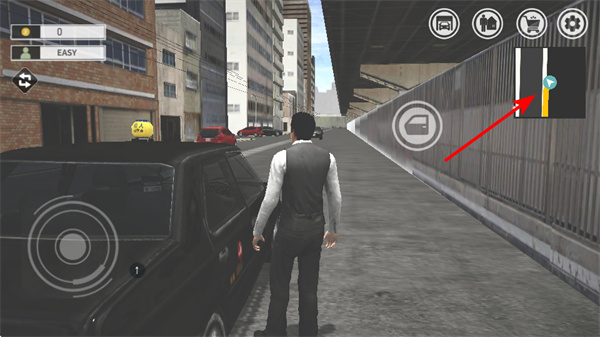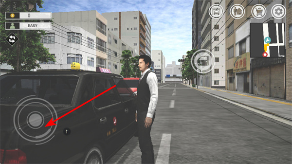 1、掌握移動操作,通過左側的操控按鈕,控制角色在城市街道中移動,靠近出租車或前往任務地點。
