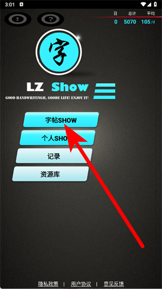 1、打開練字秀,點(diǎn)擊界面中的字帖SHOW按鈕,進(jìn)入字帖選擇界面。