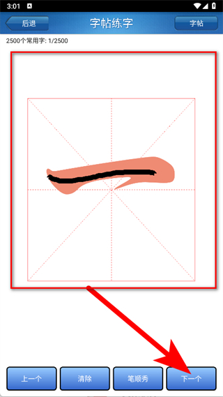 4、在字帖練字頁面,根據(jù)顯示的筆畫練習(xí)寫字,練完當(dāng)前字后,點(diǎn)擊下一個按鈕,繼續(xù)練習(xí)。