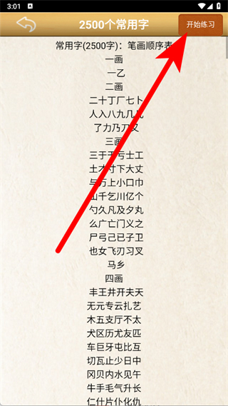 3、進(jìn)入字帖內(nèi)容頁面后,點(diǎn)擊開始練習(xí)按鈕,進(jìn)入練字環(huán)節(jié)。