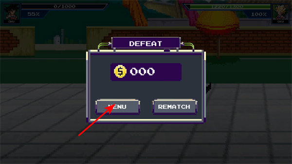 1、戰(zhàn)斗失敗后,點擊MENU按鍵,可返回游戲主菜單,在能選擇重新挑戰(zhàn)、更換角色進行設置操作。
