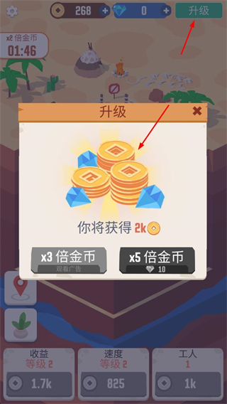 2、升級(jí)收益、速度、工人數(shù)量,提升挖掘效率,增加金幣獲取量;升級(jí)等級(jí)可獲得大量金幣獎(jiǎng)勵(lì)。