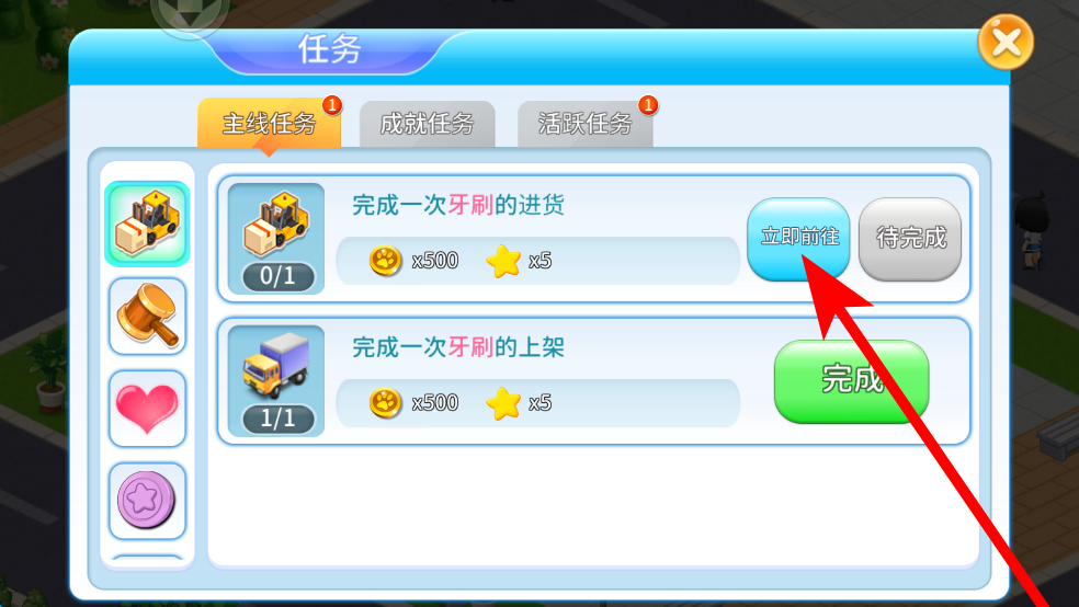 2、重視任務系統(tǒng),主線任務會指引進貨上架等操作,點擊立即前往可快速完成,完成后獲得金幣和星星獎勵,助力超市發(fā)展。