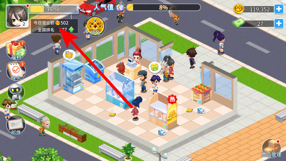 3、關注營業(yè)額與排名,通過上架受歡迎商品、及時補充庫存提升營業(yè)額,營業(yè)額增長可提高全國排名,獲得更多經(jīng)營成就感。