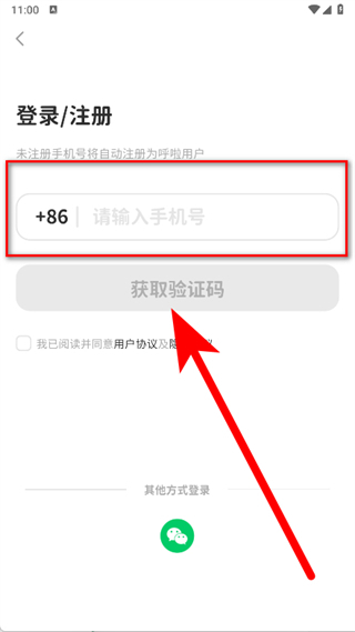 3、在登錄注冊(cè)界面,輸入手機(jī)號(hào),勾選后,點(diǎn)擊獲取驗(yàn)證碼。