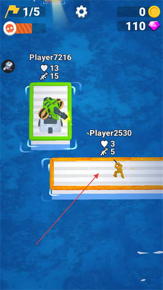 1、在木筏上與其他玩家如Player2530對(duì)戰(zhàn),利用武器攻擊,減少對(duì)方生命值。