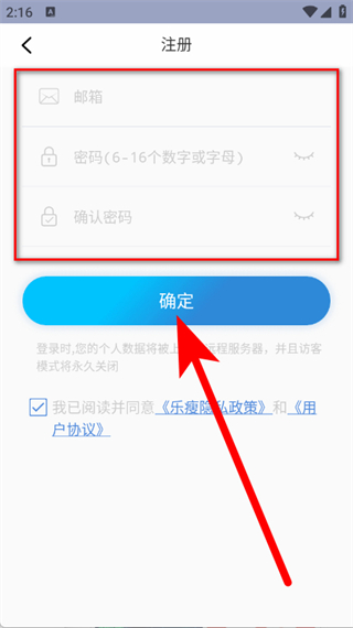 4、填寫郵箱、設(shè)置密碼并確認,勾選后,點擊確定,完成賬號注冊。