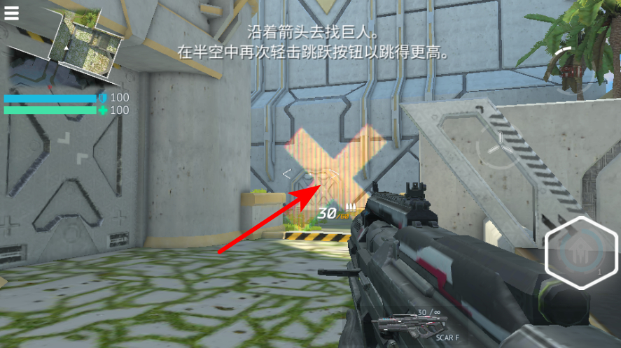 4、沿著箭頭方向前進,再次輕擊跳躍按鈕可跳得更高,可跨越障礙或到達高處區(qū)域,推進游戲進程。