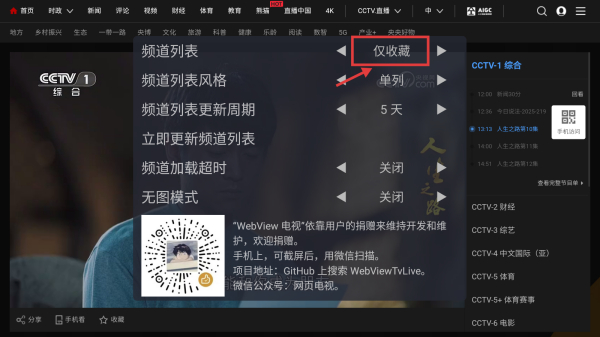 4、在頻道列表風(fēng)格選擇項(xiàng)中,點(diǎn)擊僅收藏選項(xiàng),將頻道列表設(shè)置為僅顯示收藏的頻道。