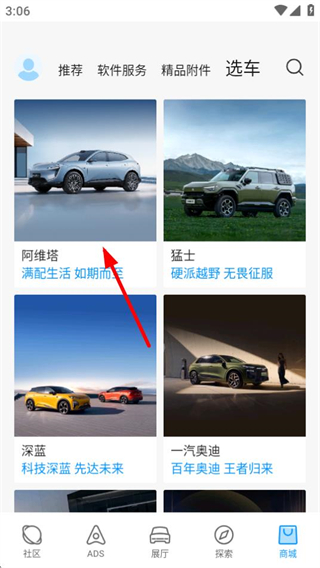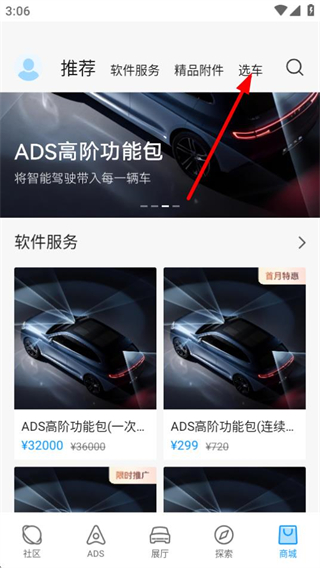 2、在商城頁面,點擊頂部選車標(biāo)簽,進入選車頁面。