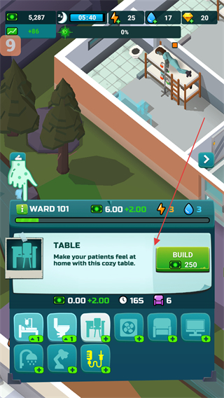 2、進入WARD101區(qū)域,點擊TABLE對應(yīng)的BUILD按鈕花費250資源建造桌子。