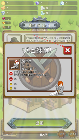 2、通過職介所建筑我們可以招募不同兵種的戰(zhàn)士,點(diǎn)擊返回城鎮(zhèn)場(chǎng)景。