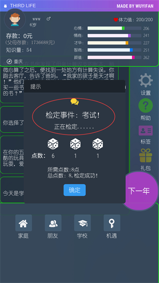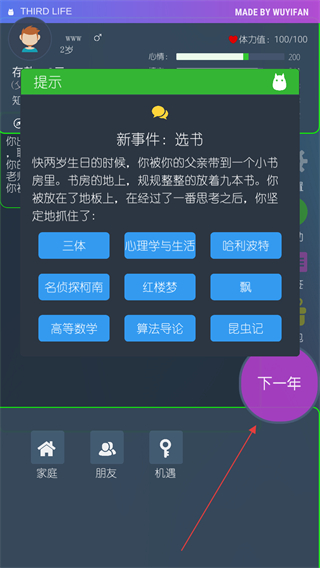 3、遇到隨機事件時,不同的選擇獲得不同加成,之后點擊下一年推進(jìn)人生進(jìn)程。