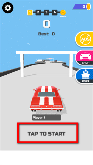 1、在超級漂移初始頁面,點(diǎn)擊TAPTOSTART按鈕,進(jìn)入游戲流程。