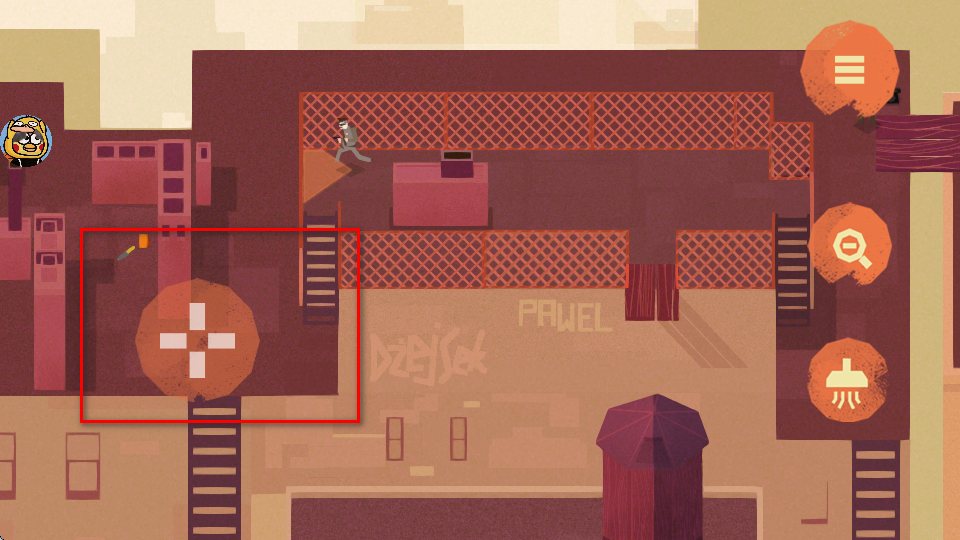 2、進(jìn)入關(guān)卡后,通過左側(cè)的十字方向按鈕控制角色移動(dòng),在場(chǎng)景中探索并躲避巡邏人員。