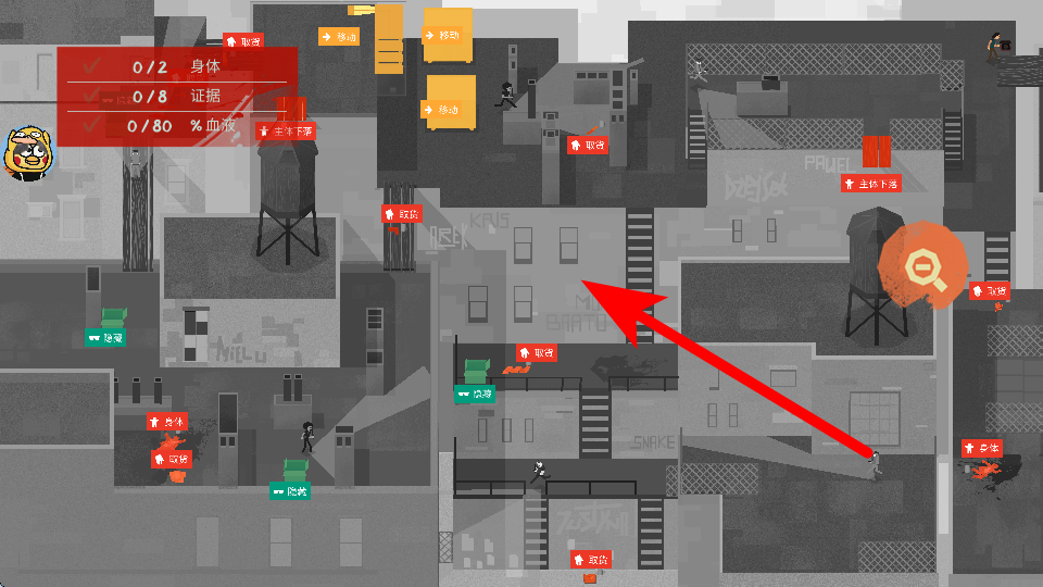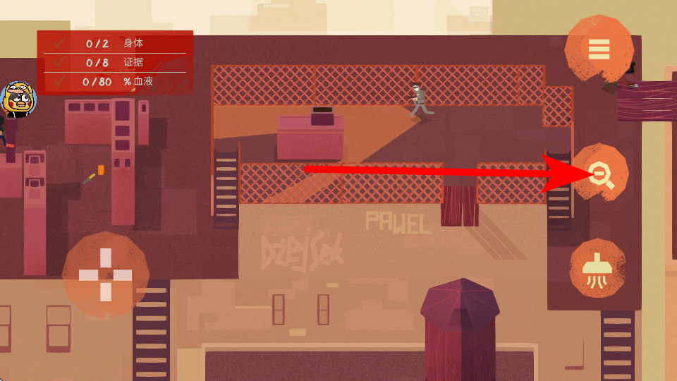 3、點(diǎn)擊界面右側(cè)的放大鏡按鈕,可查看當(dāng)前關(guān)卡的任務(wù)目標(biāo),包括收集身體、證據(jù)和清理血液。