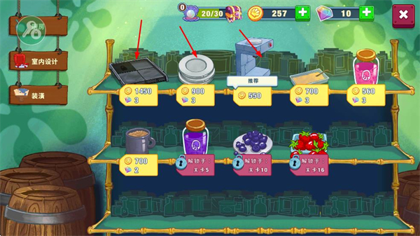 4、進入商店界面,消耗金幣購買廚房設備、食材等物資,升級餐廳配置,提升經(jīng)營效率。