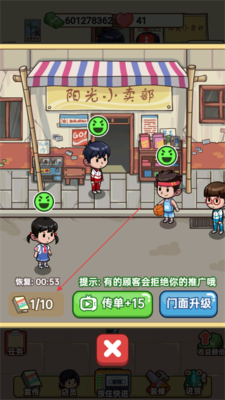 2、點擊底部宣傳按鈕,進入傳單派發(fā)界面,點擊傳單+15按鈕向顧客派發(fā)傳單,積累傳單數(shù)量。