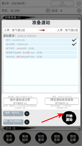 4、滿足渡劫條件后,點(diǎn)擊開始渡劫可沖擊更高修仙境界,會(huì)提升境界等級(jí)如煉氣期2層,解鎖修仙功能與挑戰(zhàn)內(nèi)容。