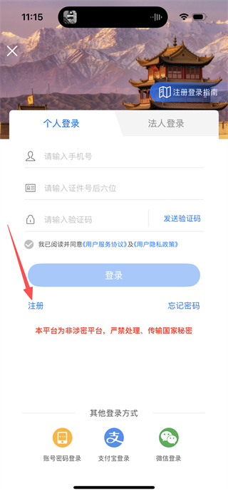 3、在登錄頁(yè)面,點(diǎn)擊注冊(cè)選項(xiàng),進(jìn)入注冊(cè)使用說(shuō)明頁(yè)面。