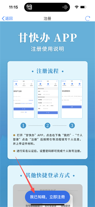 4、在注冊(cè)說(shuō)明頁(yè)面,點(diǎn)擊我已知曉立即注冊(cè)按鈕,進(jìn)入注冊(cè)方式選擇頁(yè)面。
