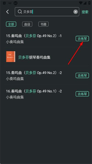3、在搜索結(jié)果中找到目標曲目,點擊對應(yīng)的去練琴按鈕,開始該曲目的練習(xí)操作。