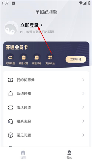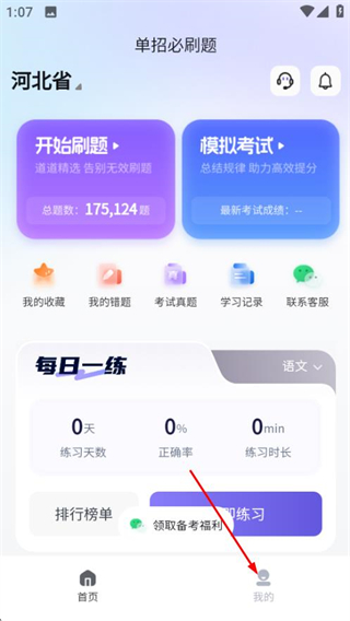 1、在單招必刷題首頁,點擊底部的我的選項,進入個人中心頁面。