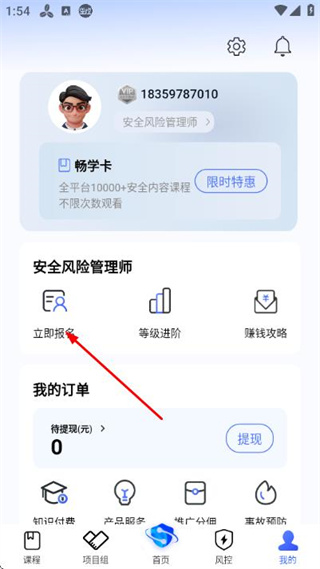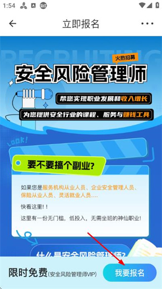2、在我的頁(yè)面點(diǎn)擊立即報(bào)名,進(jìn)入安全風(fēng)險(xiǎn)管理師的立即報(bào)名頁(yè)面。