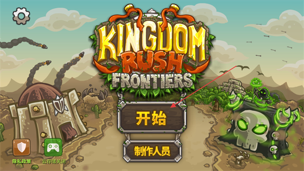 1、在王國保衛(wèi)戰(zhàn)6廢土世界啟動(dòng)界面,點(diǎn)擊開始進(jìn)入游戲,同時(shí)可查看隱私政策或調(diào)整云存儲(chǔ)關(guān)閉狀態(tài)。