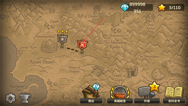 2、進(jìn)入游戲地圖界面,選擇地圖上可挑戰(zhàn)的紅旗關(guān)卡,可通過商店、英雄殿堂等功能籌備關(guān)卡所需資源。